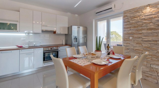 Das Haus liegt im beliebten Ferienort Nerezine auf der Insel Lošinj. Lebhafter Hafenort mit großartiger Bergkulisse auf der Insel Lošinj. Die überwiegend grüne und sehr buchtenreiche Insel Losinj verdankt ihre subtropisch anmutende Vegetation vieler Generationen von Seefahrern, die zahlreiche exotische Pflanzen als Mitbringsel aus fernen Ländern in die Heimat brachten und Parks mit Palmen, Agaven, Oleander und Orangenbäumen anlegten. Das idyllische Fischerdorf Nerezine ist ein beliebter Ferienort für Bootsbesitzer und Naturliebhaber, die von hier aus zu erlebnisreichen Touren über die Insel starten können. Entlang der Hafenpromenade befindet sich auch das Zentrum der touristischen Infrastruktur, das mit einem Einkaufszentrum mit Supermarkt, Restaurants und Cafés keine Wünsche offen lässt. Wer es lieber etwas ruhiger und authentischer mag, findet im alten Dorfkern mit dem an eine italienische Piazza erinnernden und von alten Bäumen umstandenen Hauptplatz malerisches inseltypisches Flair, dem die Cafés und angenehm überschatteten Bänke noch zusätzlichen Charme verleihen.